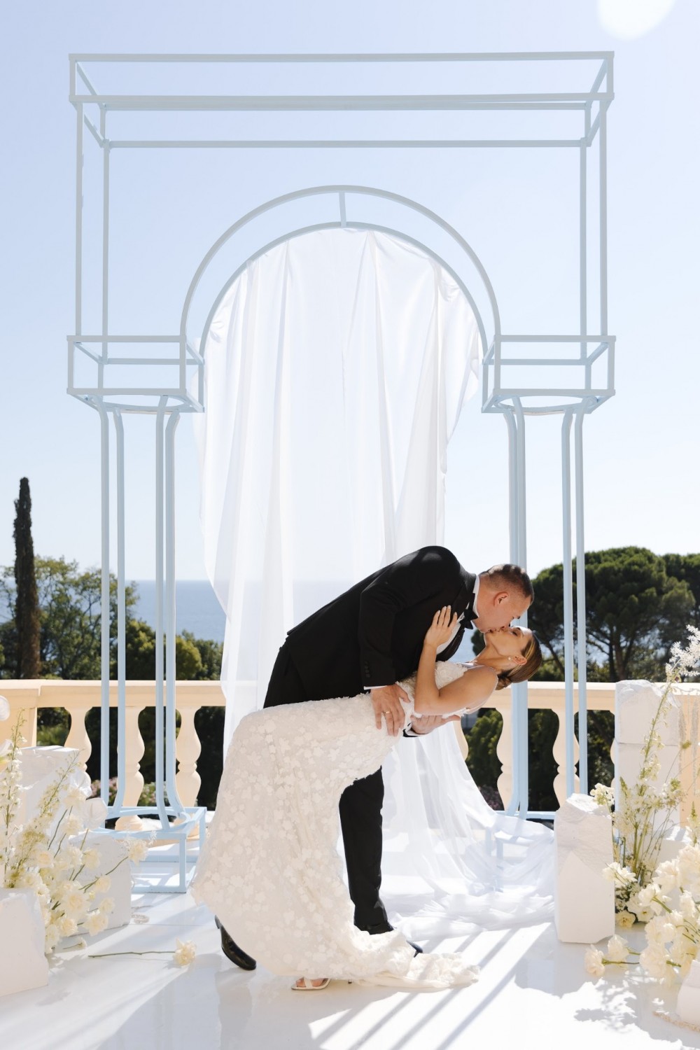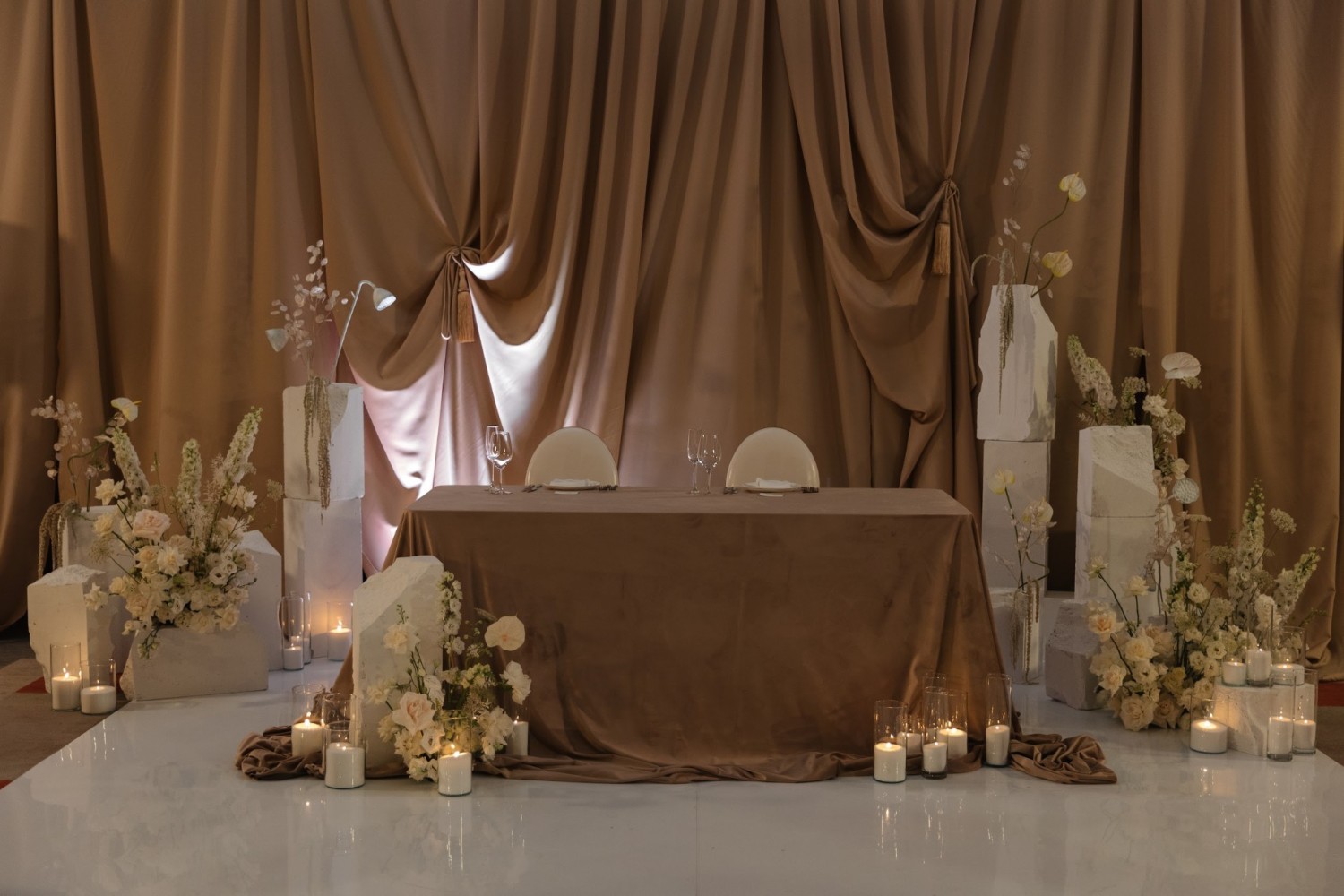 История этой пары, длиною в 10 лет, была очень разной, парой непростой, но каждый этап они преодолевали вместе, держась за руки и "проходя сквозь стены". Эти самые "стены" мы ассоциировали с проходом пары под каждой аркой на церемонии, а на ужине и вовсе создали "мягкое пространство", будто без стен. Там, где берет начало новая семья, не будет больше преград и царит легкость и мягкость.
